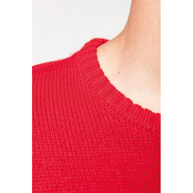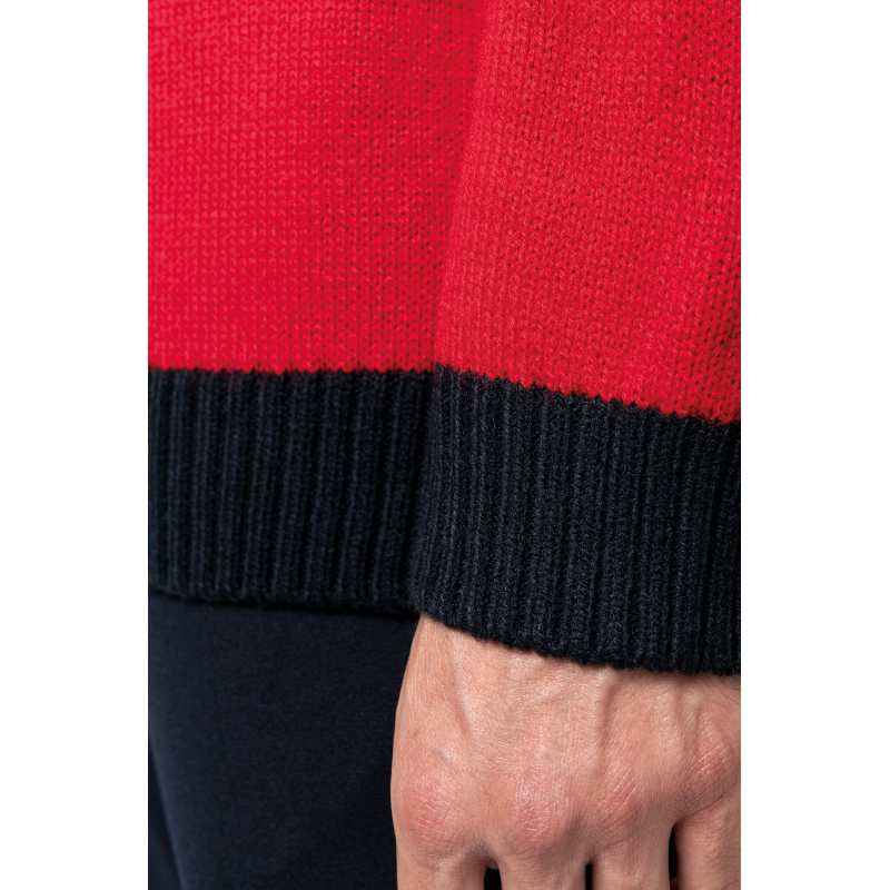 85% acrylique / 15% laine - Jauge 5 - Col rond - Finitions bord-côte ton sur ton à l'encolure et contrastées aux poignets et bas de vêtement. Certifié STANDARD 100 by OEKO-TEX® N° CQ 1007/7, IFTH.