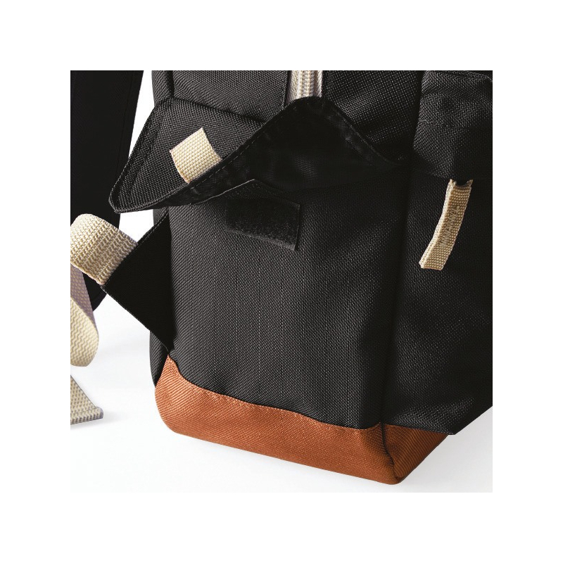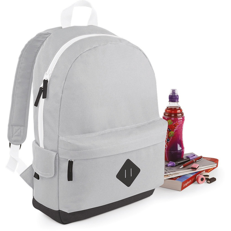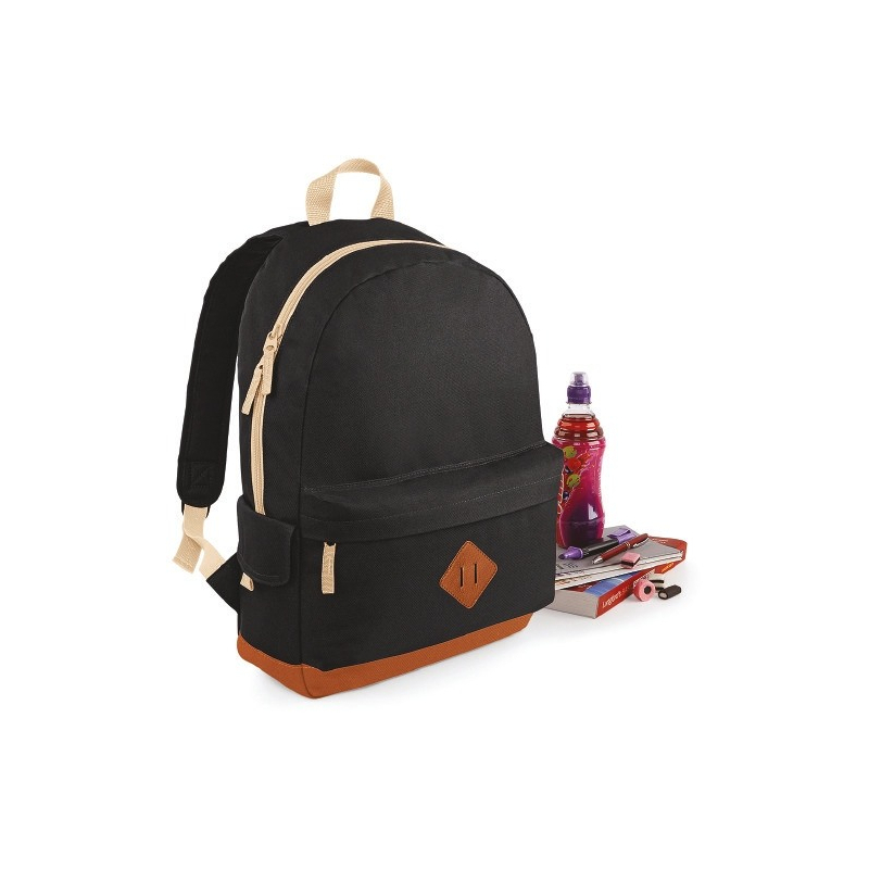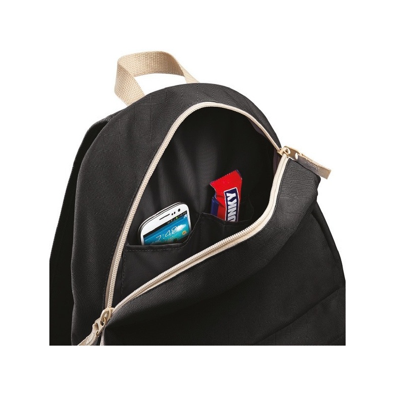 Polyester 600D, étiquette détachable tearaway, dos matelassé, bandoulières matelassées ajustables, poignée de transport, poche frontale zippée, poches internes, poches latérales.