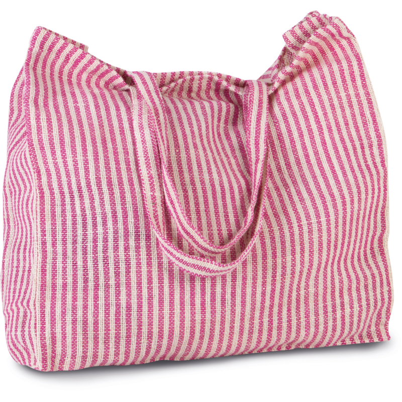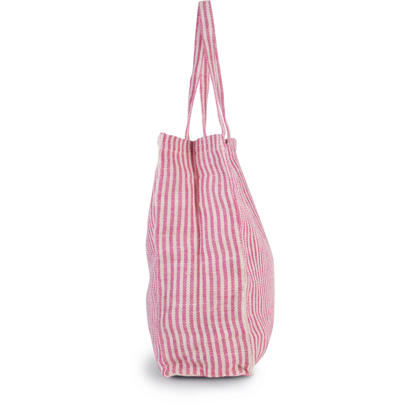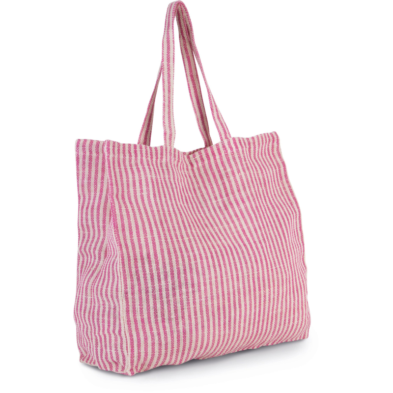 Sac shopping en jute et coton (juco) de forme carrée avec rayures en tissé-teint. Poche intérieure zippée. Poignées de 55 cm dans le même tissu.