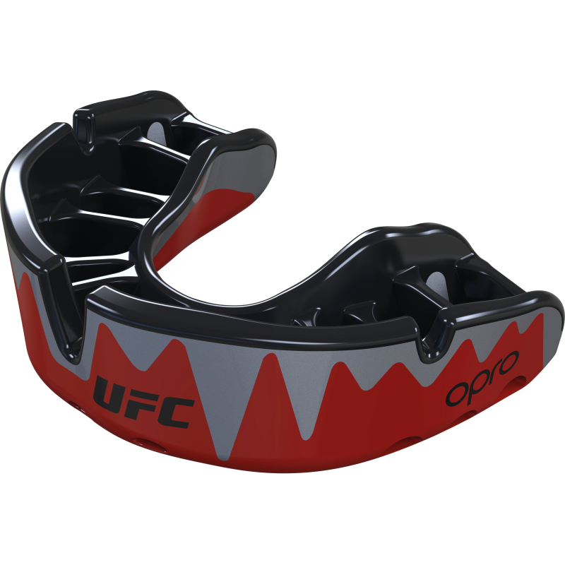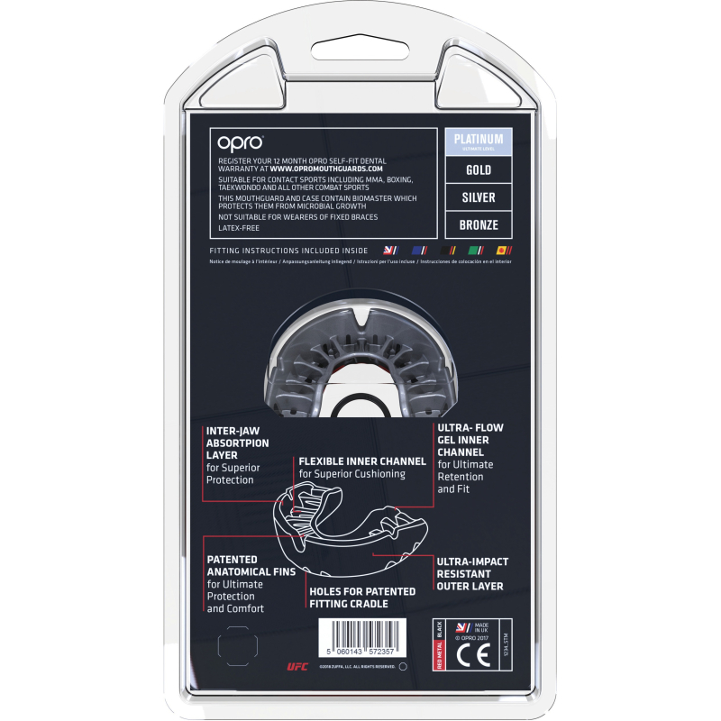 Opro détenteur officiel de la licence UFC. Résistance, absorption des chocs et confort grâce à sa double matière et à ses 13 ailettes brevetées qui épousent la forme des dents lors du moulage. Son support d'installation garantit une épaisseur minimale de la surface mordue, facilite le moulage et offre plus d’amortie et de protection (coussins d'air). Technologie antimicrobienne Biomaster (formation des bactéries évitée jusqu’à 99.99 %). Zones extensibles pour un ajustement optimal. Ouverture au niveau du palais pour une meilleure respiration et élocution. Packaging compatible à la présentation sur broche. Livré avec étui de protection et mode d’emploi. Certification CE. Sans latex. Ne convient pas aux porteurs d’appareils orthodontiques fixes. Peut être utilisé pour tous les sports de contact de 7 ans à adulte.