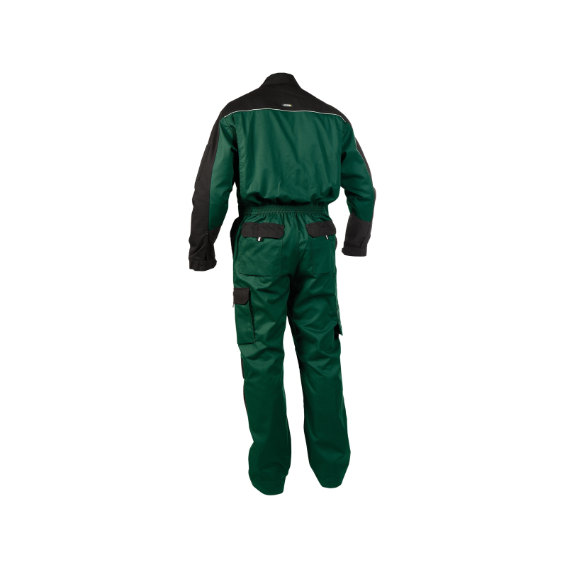 Combinaison de travail bicolore avec poches genoux DASSY® Cannes poignets réglables avec velcro, fermeture à glissière double sens, cachée sous rabat, 2 boutons-pression, plis d'aisance dos, 2 poches italienne, 2 passe-mains, 2 poches poitrine, 2 poches arrière avec rabat, 2 poches cuisse, poche outils, porte-crayon, poche mètre, poche téléphone, poches genoux ajustables en Cordura®, élastique dos fixe, coupe droite, biais réfléchissant, coutures triples, ourlet large (extra 5 cm), testé substances nocives d'après Oeko-Tex® Standard 100 (0910058/Centexbel)