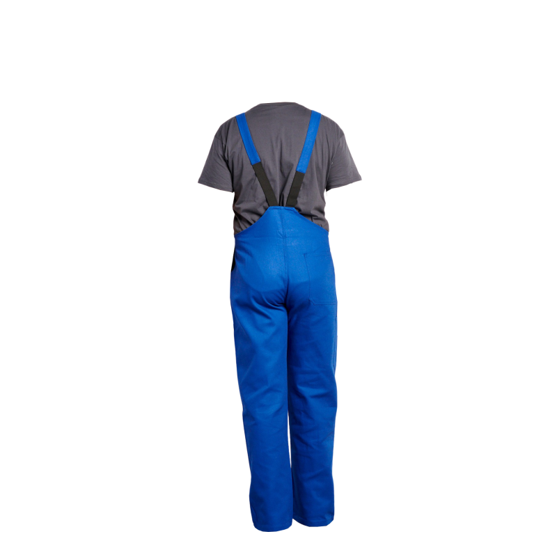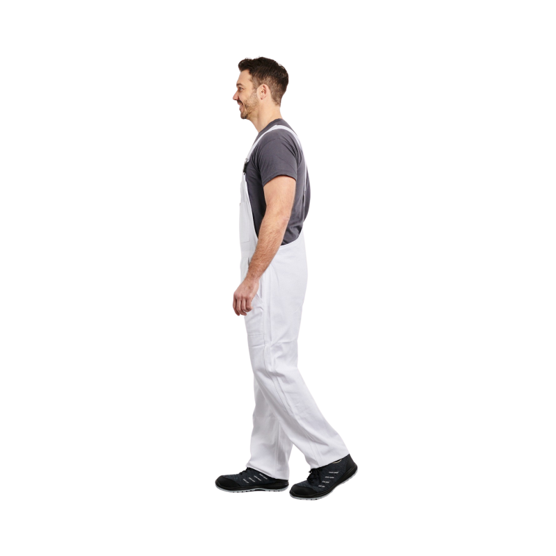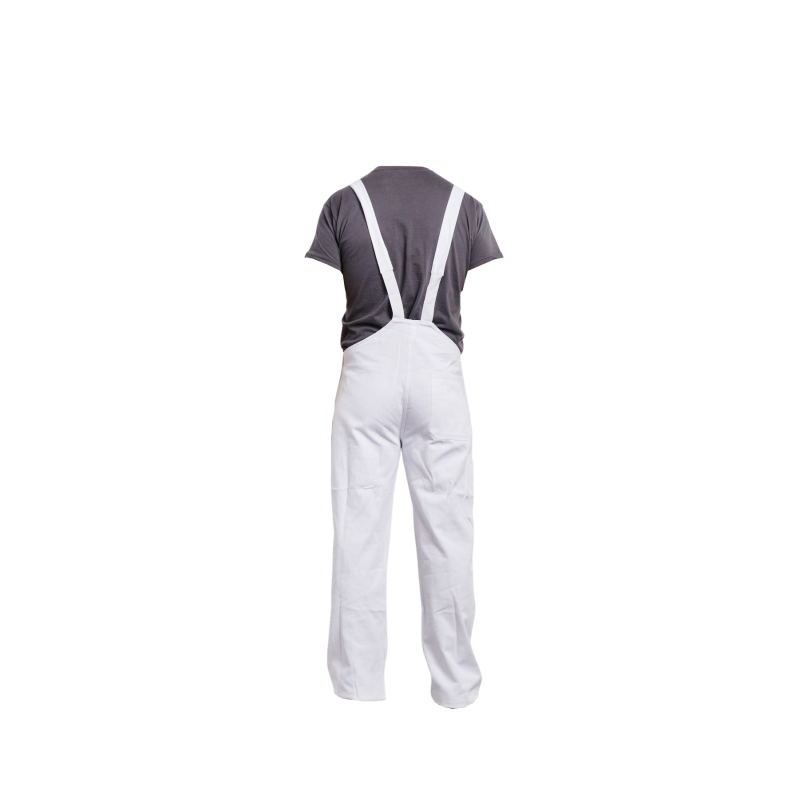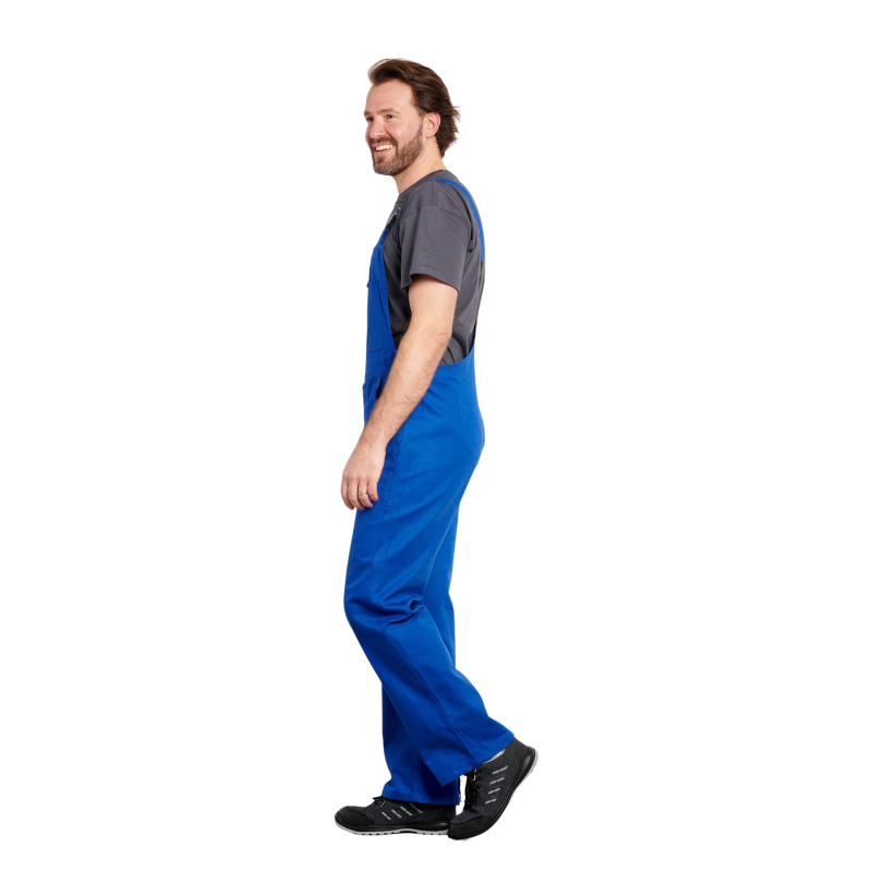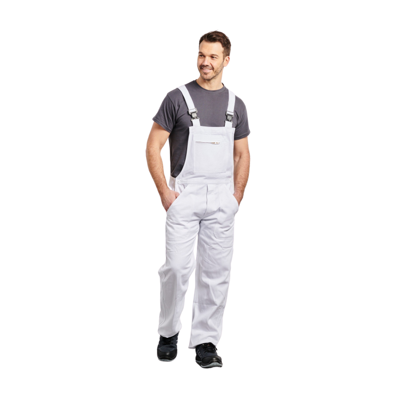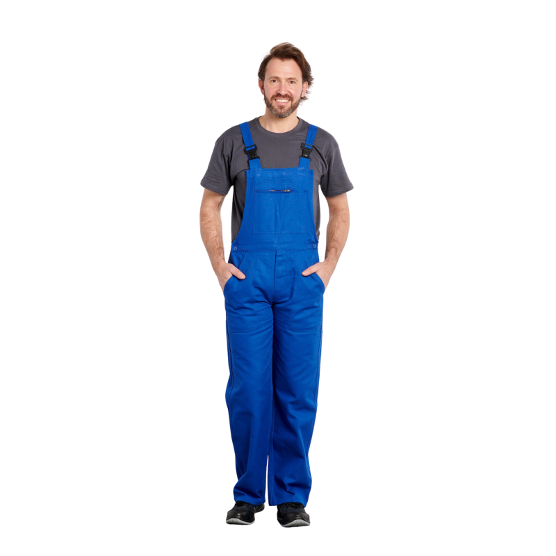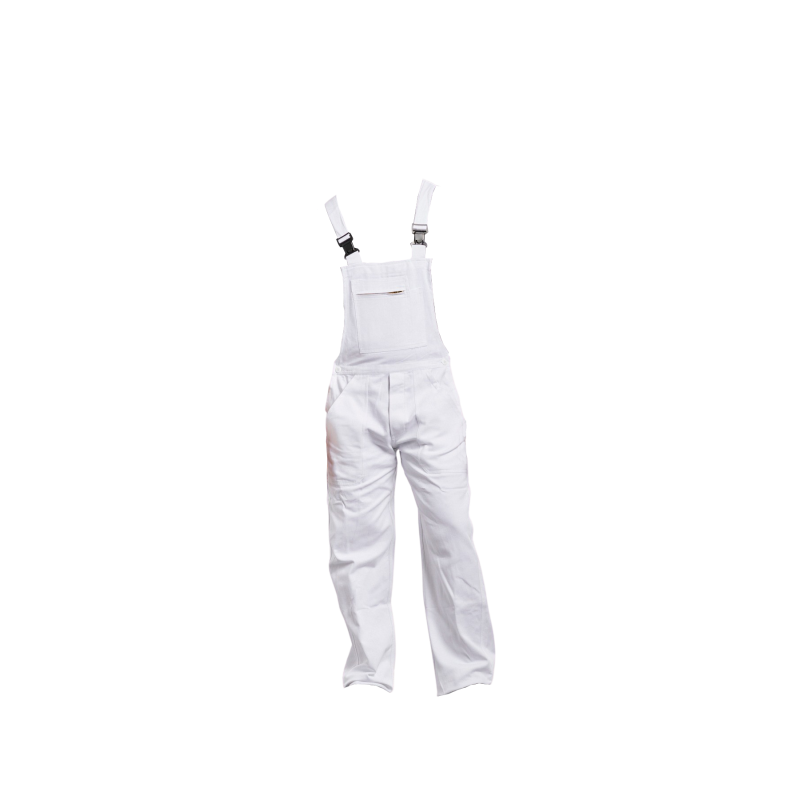 Cotte  bretelles, 1 poche bavette avec fermeture mtal, 1 poche crayon, 2 poches basses, rglage cts par boutons, 1 poche arrire, 1 poche mtre, boucles plastique, braguette boutons