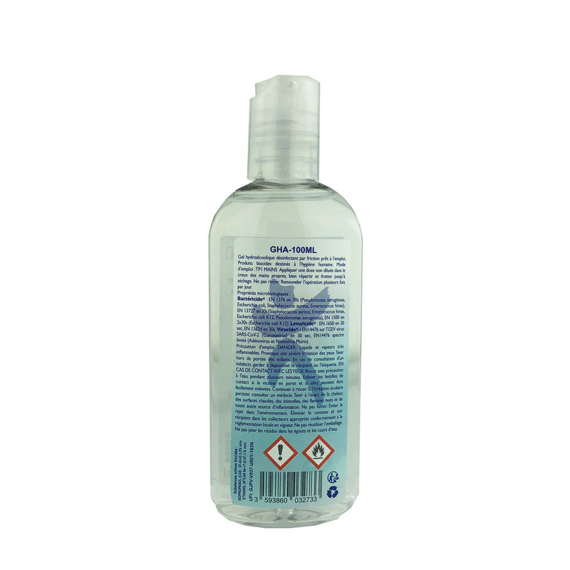 GEL HYDROALCOOLIQUE 100ML PAR 24 Substances actives biocides : ETHANOL (N°CAS 64-17-5) 67,1.% m/m et ISOPROPANOL (CAS : 67-63-0) 3,3% (m/m)
