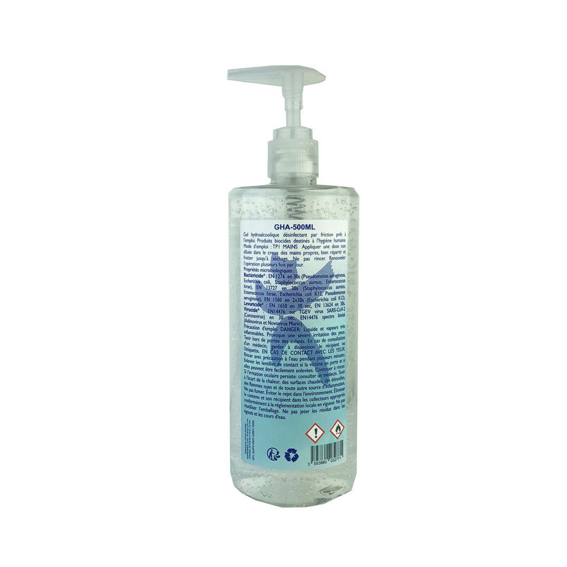GEL HYDROALCOOLIQUE 500ML PAR 6 Gel Hydroalcoolique en flacon pompe de 500 ml pour un usage professionnel. Produits biocides destins l\rquote hygine humaine