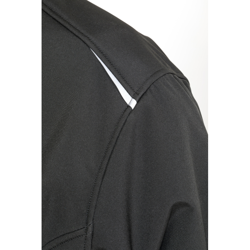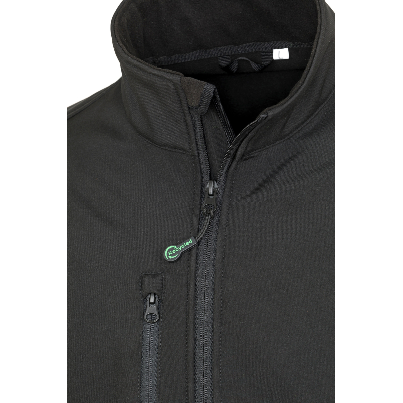 100% polyester. 100% polyester recyclé. Fabriqué à partir de bouteilles en plastique PET. Softshell 3 couches. Couche extérieure: Polyester TOPGREEN®. Finition déperlante durable. Couche intermédiaire: membrane TPU imperméable 8000mm, 1000g respirante et coupe-vent. Couche intérieure: micropolaire. Fermeture zippée YKK avec mentonnière et tirette. Passepoil réfléchissant aux épaules avant et à l'arrière. Empiècements avant et dos décoratifs. Poche zippée latérale et sur la poitrine gauche. Taille et poignets ouverts. Col montant. Patte de suspension.