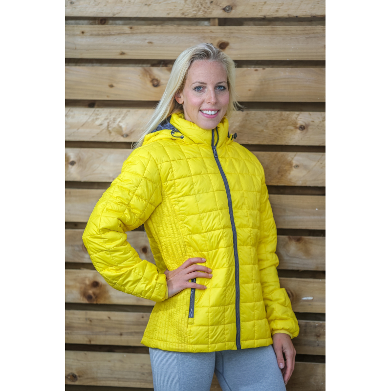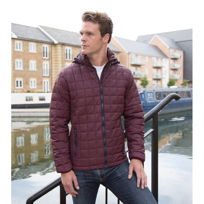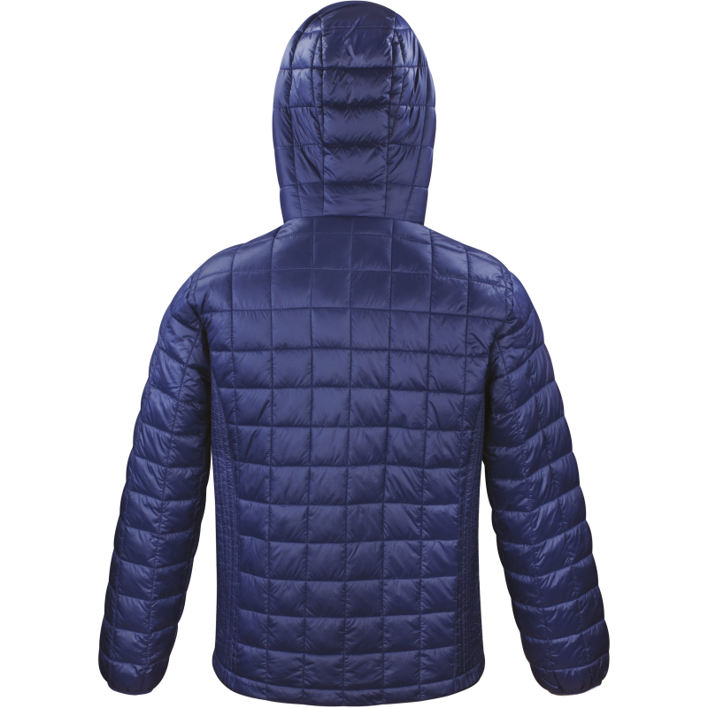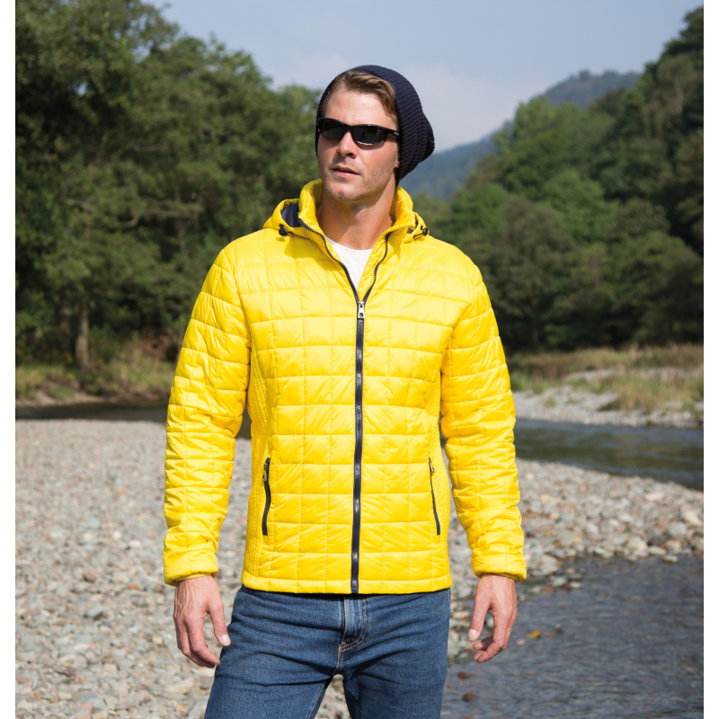 Extérieur 100% nylon 20D avec enduit AC et doublure contrastée 100% nylon 20D. Garnissage intérieur matelassé 100% polyester 250g en forme de carreaux avec empiècements latéraux en maille froncée. Résistant à l'eau et coupe-vent. Col montant avec capuche attenante, réglable par cordon de serrage. 2 poches latérales zippées et 1 poche intérieure. Zips et doublure contrastés. Poignets élastiqués doux. Patte de suspension cousue à l'intérieur du col. Coupe moderne.